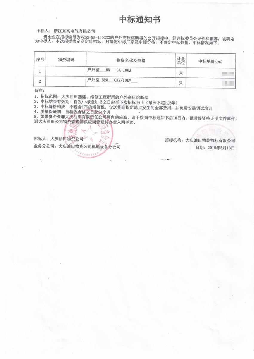 2015年浙江东高电气有限公司与大庆油田物资公司中标通知书。
