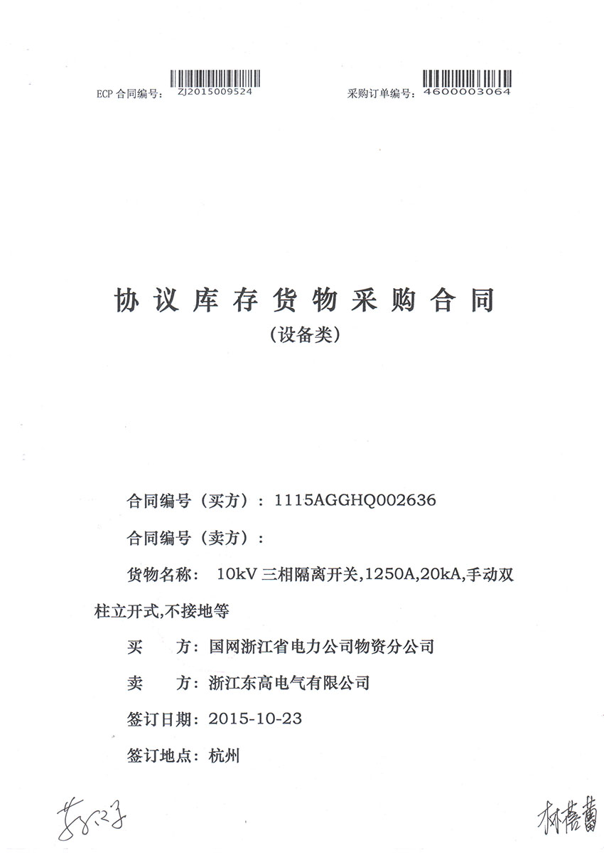2015年浙江东高电气有限公司与国网浙江省电力公司物资分公司采购合同。
